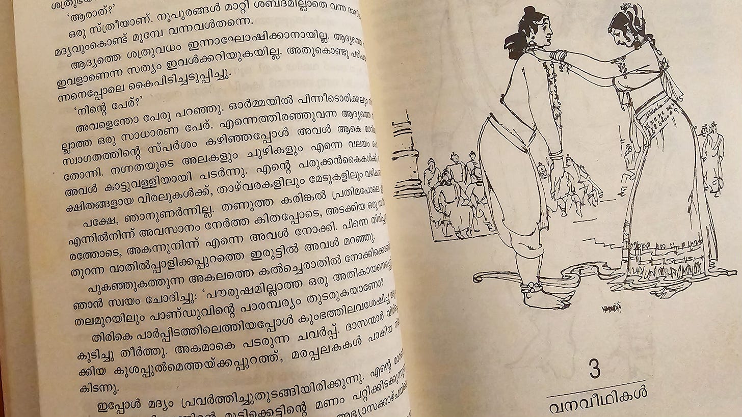 രണ്ടാമൂഴം is a perennial favourite whose lines are inscribed in the back of my eyelids, it feels sometimes. The description of the battles, the shades of Kunti that I discovered with a shock, and one phrase in particular about the purpose of women's lives. സ്ത്രീകളോ? ഗർഭപാത്രങ്ങൾ. Wombs, not women.